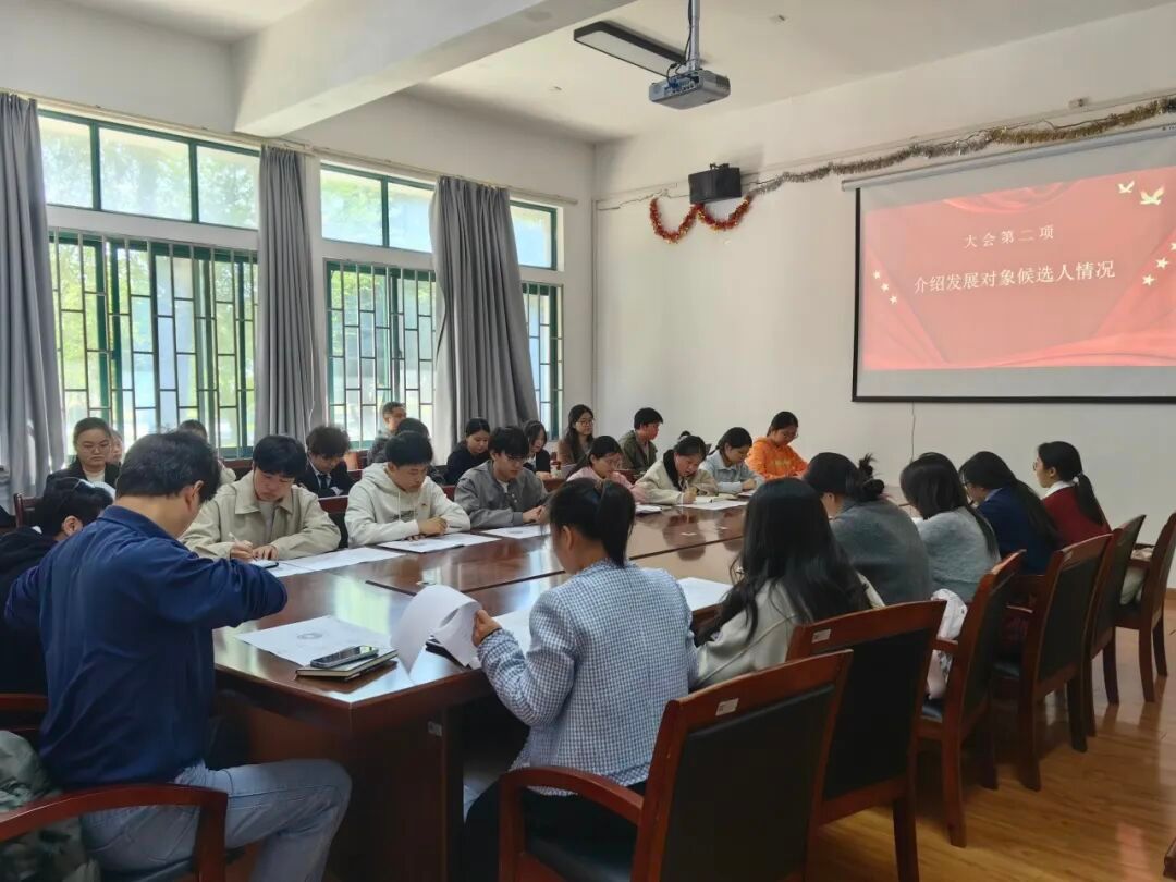 学院党总支书记祝方清、副书记王松、党建指导老师郭雅纯、辅导员张忠萌、全体学生党员及11位拟发展对象参会。