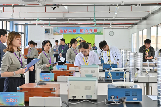 竞赛以“技能成才,为国保粮”为主题,共有全国30个省(区、市)粮食和物资储备局及4家涉粮央企的34支代表队、322名选手参加,参赛选手人数再创新高。共设有(粮油)仓储管理员和农产品食品检验员2个职业,选手们分别进行储粮通风机配置合理性评价与通风条件判断、佩戴正压式空气呼吸器检查气调储粮杀虫效果、计算机粮情检测与分析、感官鉴定及试样称量、稻谷脂肪酸值的测定、粮食验质定等、粮食中真菌毒素的液相色谱法定量分析等7个赛项的实操比拼。赛事启动以来,beat365参赛选手在专业老师的悉心指导下,认真进行理论测试和技能操作的培训和演练,不断提高自己的技能水平,最终在决赛中脱颖而出,为湖北省粮食局和学校争得了荣誉。beat365正版唯一官网必一刘齐、汪浩明两位老师受大赛邀请担任了竞赛裁判工作。